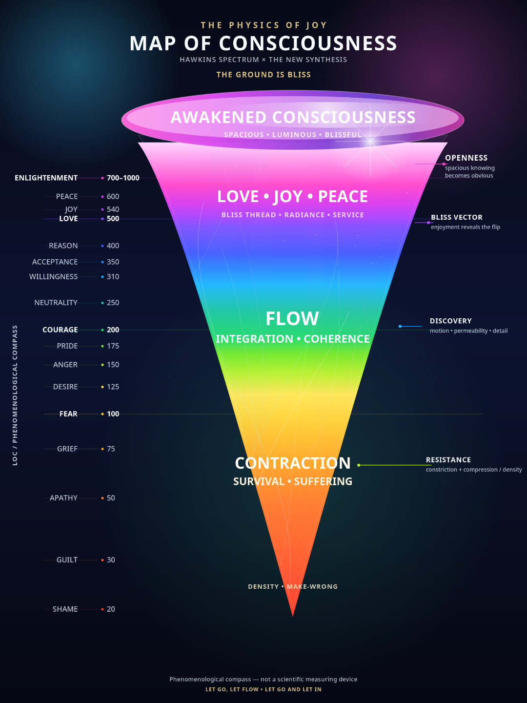 David Hawkins' Levels of Consciousness, derived from decades of clinical observation and cross-referenced with contemplative phenomenology, is often presented as a scale of spiritual development. The Physics of Joy offers a more precise and actionable reframe: the LOC spectrum is a phenomenological map of resistance and flow dynamics, describing how much constriction is operative right now, and therefore where Vivation's intervention is most needed and most potent.